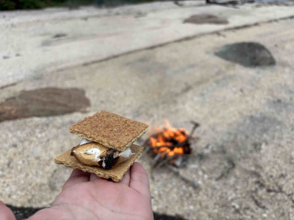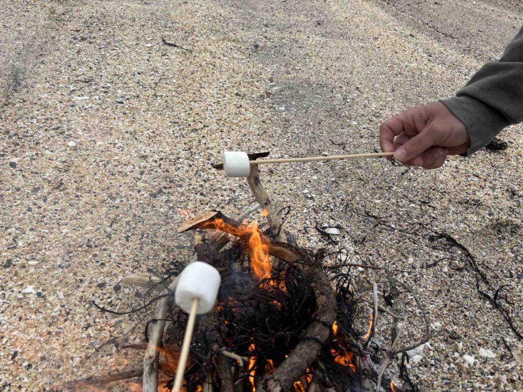 We’d been looking forward to having a small fire and making s’mores, so we went back after work even though it had gotten cold and gray. We’d never been ashore with the tide almost completely out before, and it was like exploring a whole new landscape. We found a spot below the high tide mark that was sheltered enough from the breeze, gathered a few sticks and some dried seaweed, and got our little fire started. It was just big enough to keep us warm and let us toast up a few marshmallows, and we made sure to burn it entirely to ash.