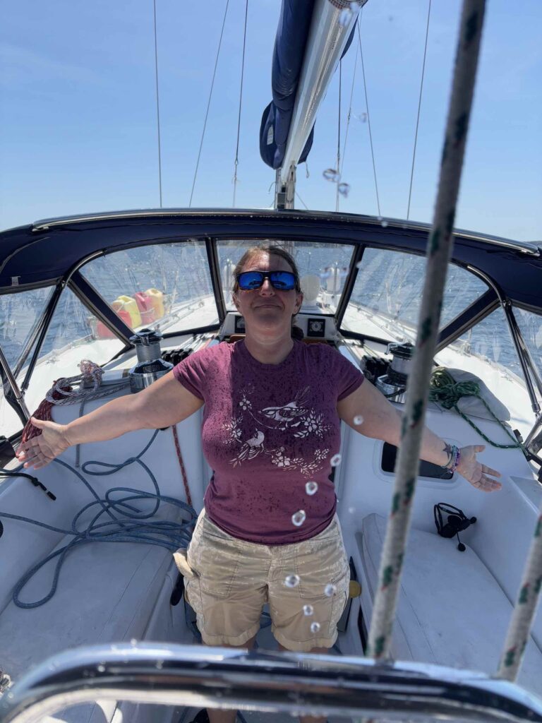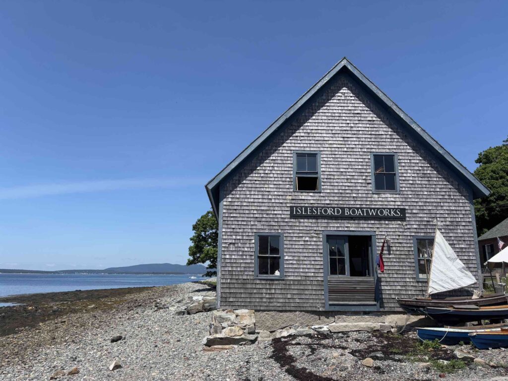 On our way to Bar Harbor, we stopped at Little Cranberry Island to visit the artist shops, Islesford Boatworks (a community boat building school), the Islesford Historical Museum (part of Acadia National Park) and have lunch at Little Cranberry Lobster. After lunch, we raised the sails and headed to Bar Harbor. Being at the helm for the raise, I got completely drenched – we hadn’t zipped the sail cover, so it was FULL of water from Saturday’s rain. It was good for a laugh anyway!