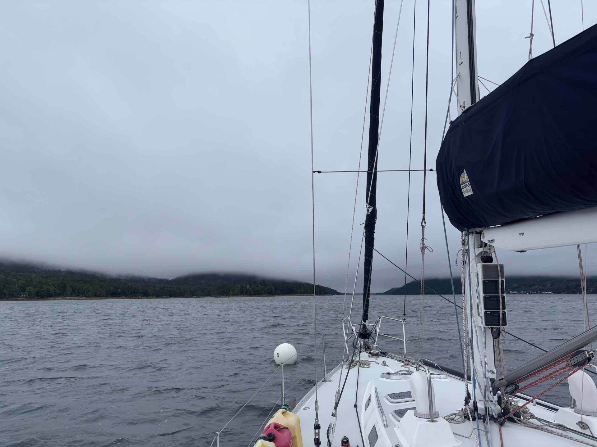 Saturday’s forecast was miserable and we were getting low on provisions, so we took advantage of the Island Explorer bus system to go grocery shopping in Bar Harbor. It would have been a relatively quick trip, but we misread the schedule and ended up waiting on the side of the road for an hour, then had to switch buses at Jordan Pond because it was time for the driver’s lunch break. But on the plus side, we meet a nice couple from California who saw our foul weather jackets and struck up a conversation – they were newer sailors who were thinking about doing some cruising, and we enjoyed getting to chat.