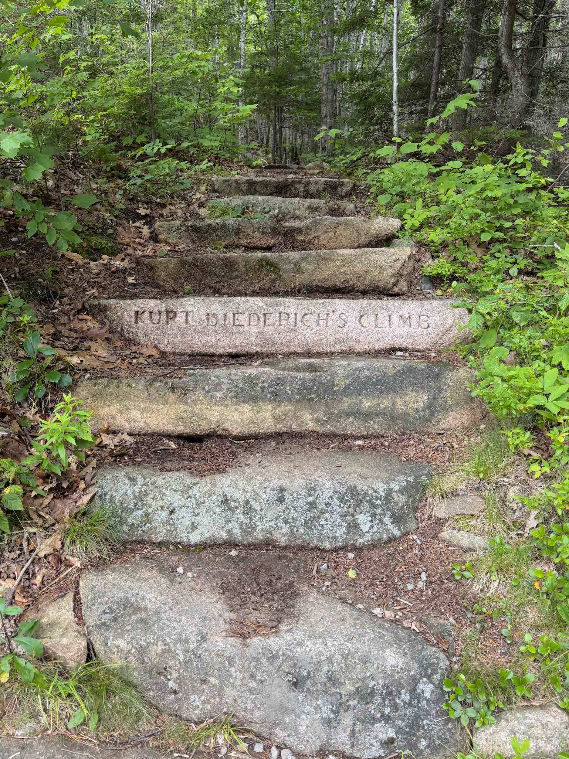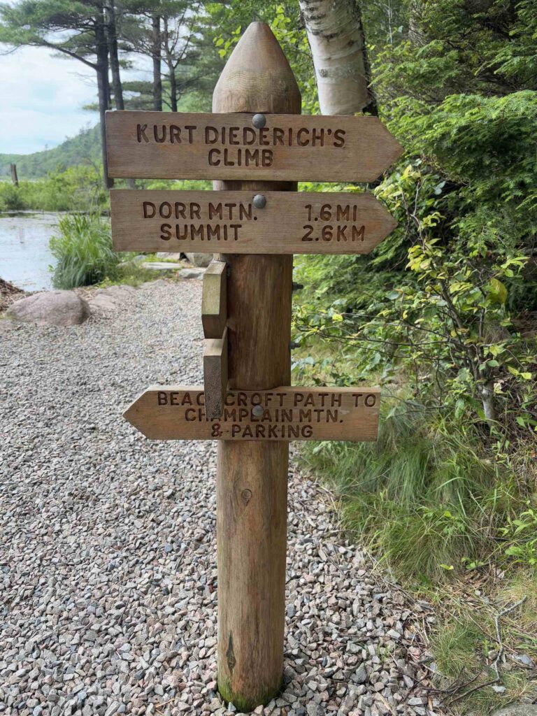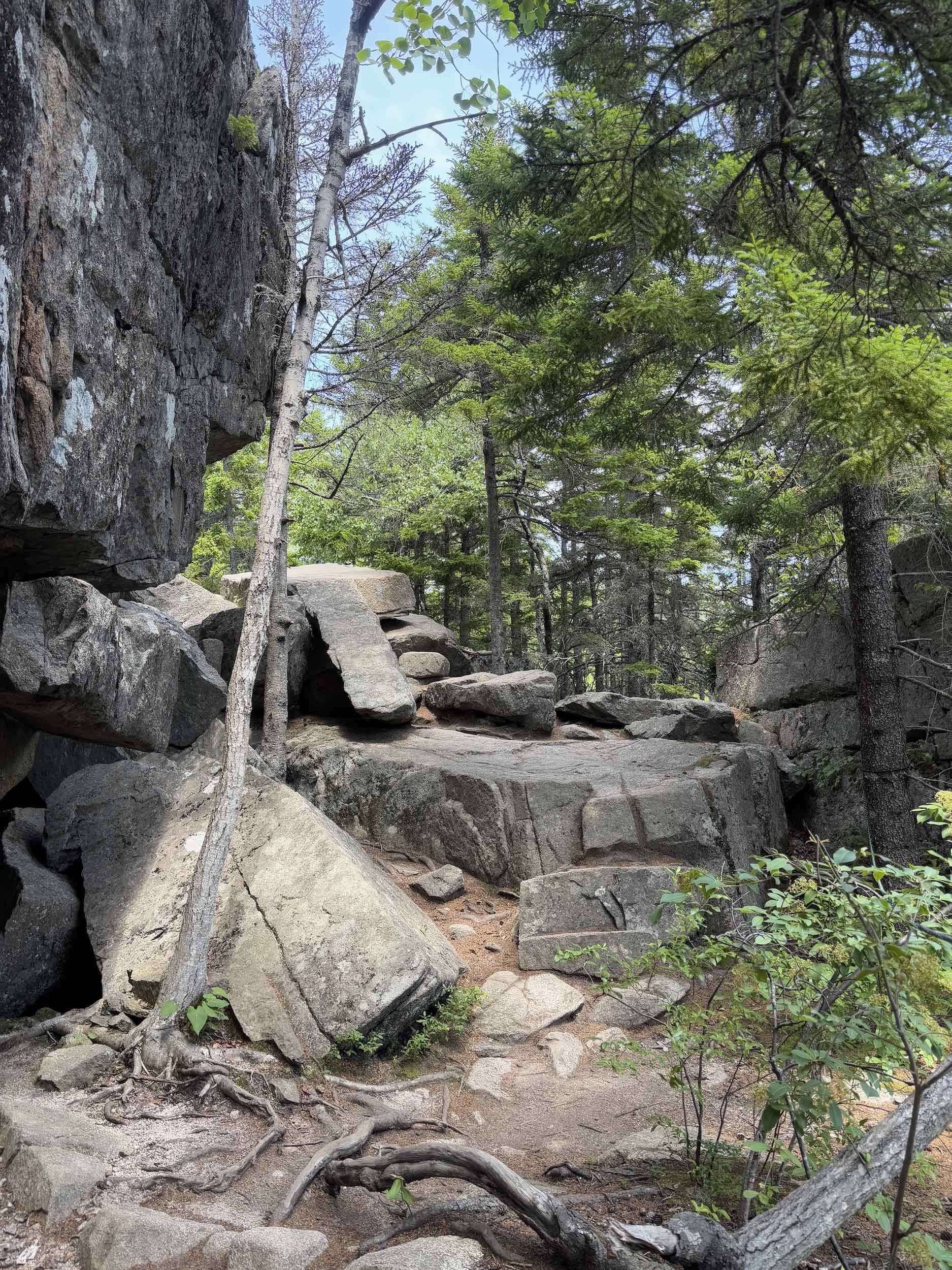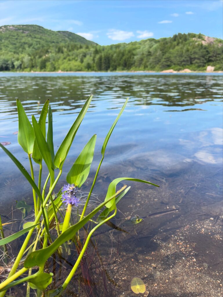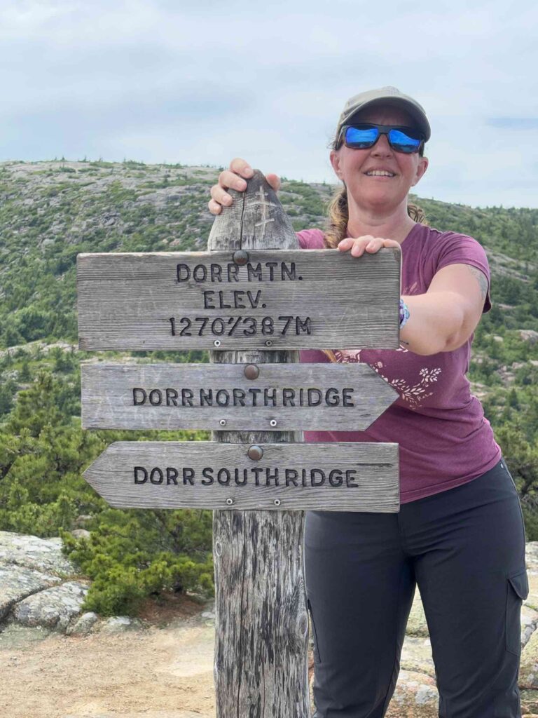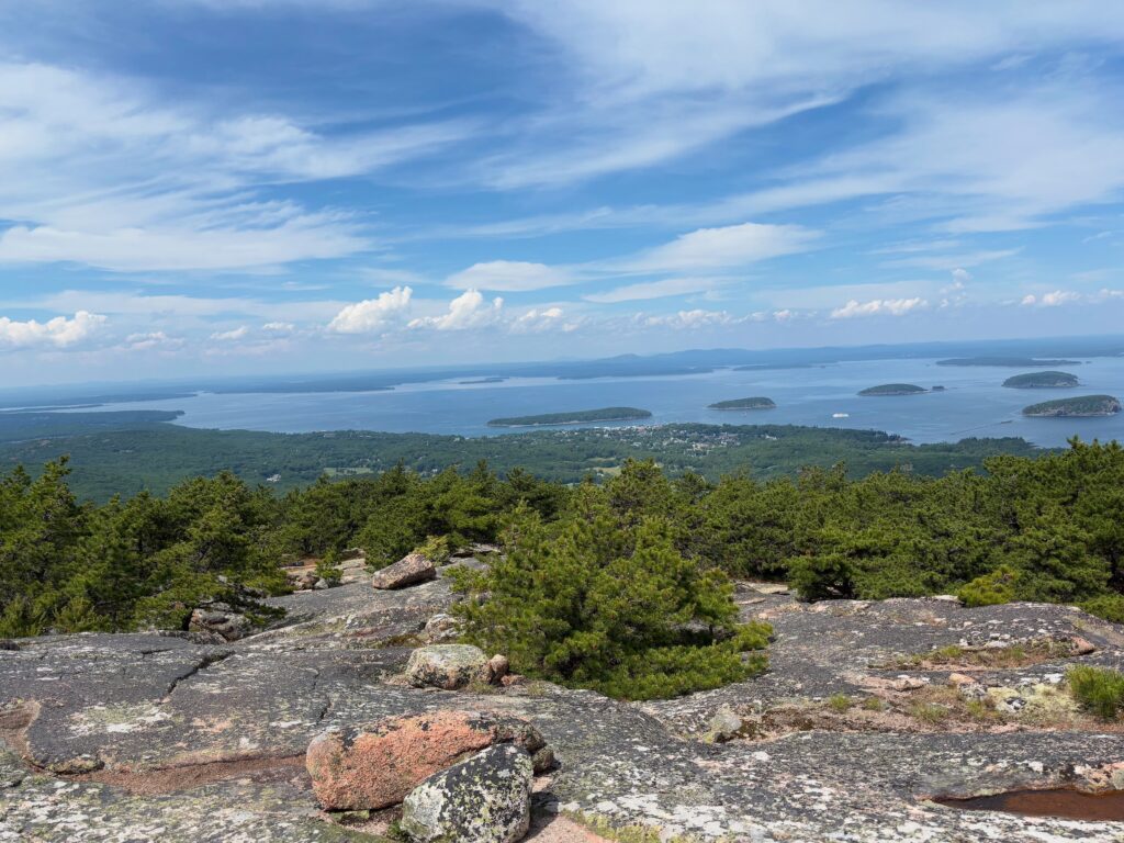 Wednesday, we hopped the bus and spent the day hiking in Acadia. We first hiked Jessup Path, an easy, flat trail through some beautiful wetlands and meadows out to Kurt Diederich’s Climb, a .4 mile steep ascent with lots of granite steps. There were a couple of little spots where my fear of heights kicked in, but for the most part, it just served as a reminder that I don’t walk up nearly enough steps in a day to be in shape for something like that! It’s a beautiful trail, though, and there are some great views. We continued along Schiff Path which felt mostly easier, but the last .4 miles is another steep ascent, this time over exposed granite, to reach the summit of Dorr Mountain. It was hot and humid, and I was definitely feeling it, but I was hell bent on reaching the summit – it was absolutely worth it. The views of Frenchman Bay and out to sea are stunning (we could even see Windara!), and I felt a major sense of accomplishment reaching the top. Dorr is the third highest peak in the park (1270′), sitting about 300 feet below Cadillac. We could see all the people on top of Cadillac, but we had the Dorr summit to ourselves and passed only a handful of hikers all day. We returned via the Dorr North Ridge Trail, which descends 970 feet in .8 miles. The trail is a combination of exposed granite, lots of tree roots, and some rock scrambles, so it was slow going but really pretty, and we got to the Wild Gardens of Acadia with time to spare before catching the bus back to town.