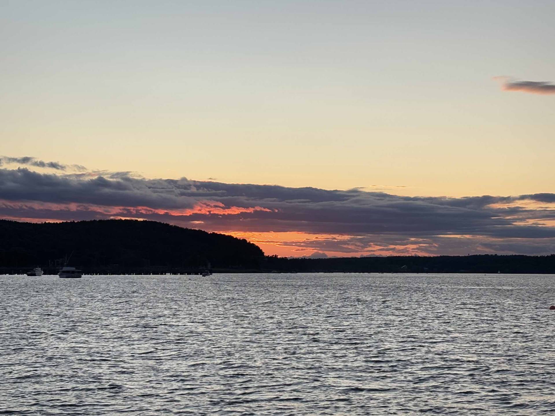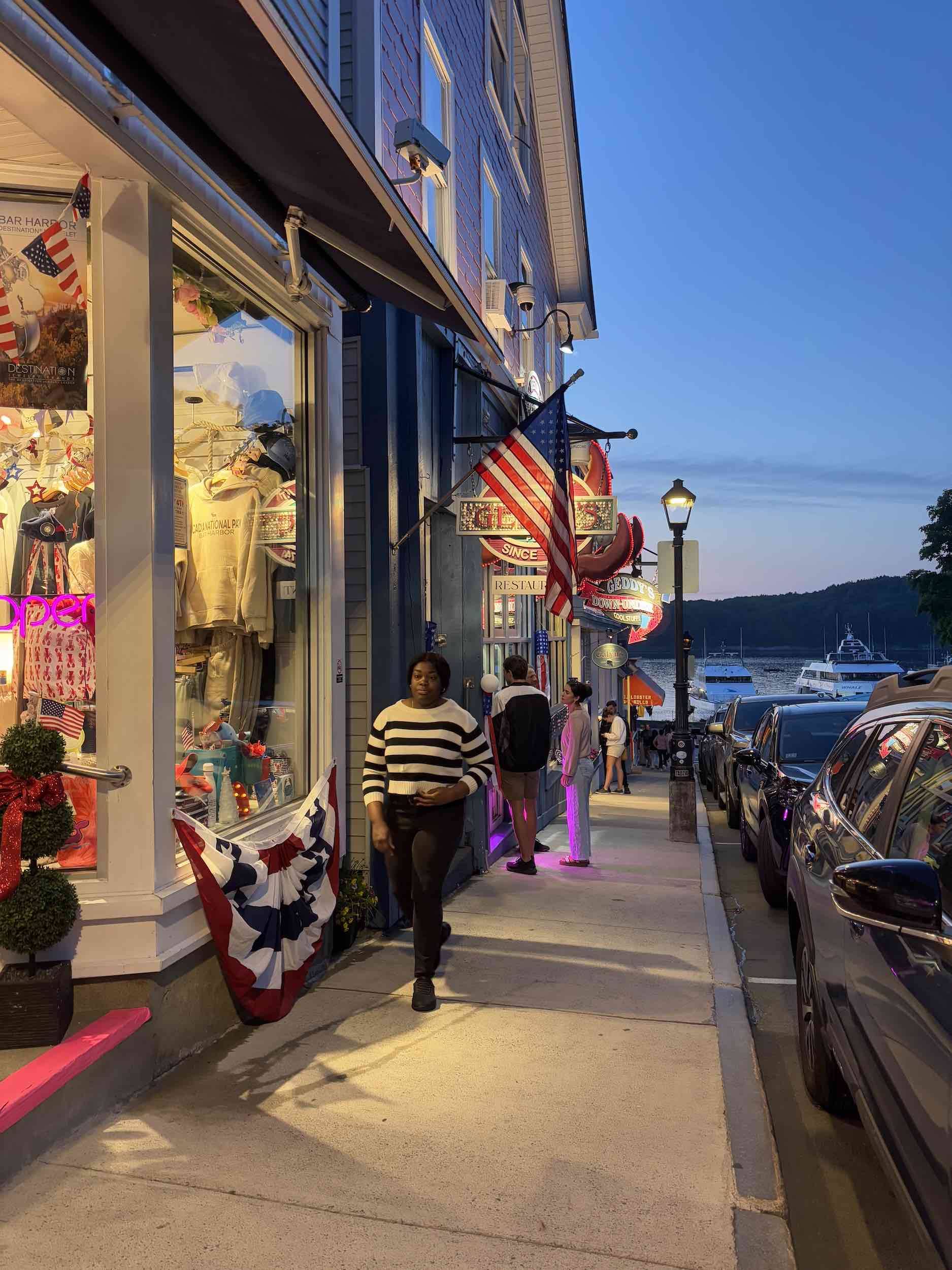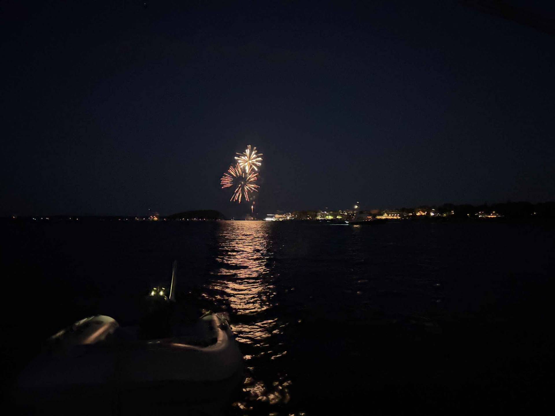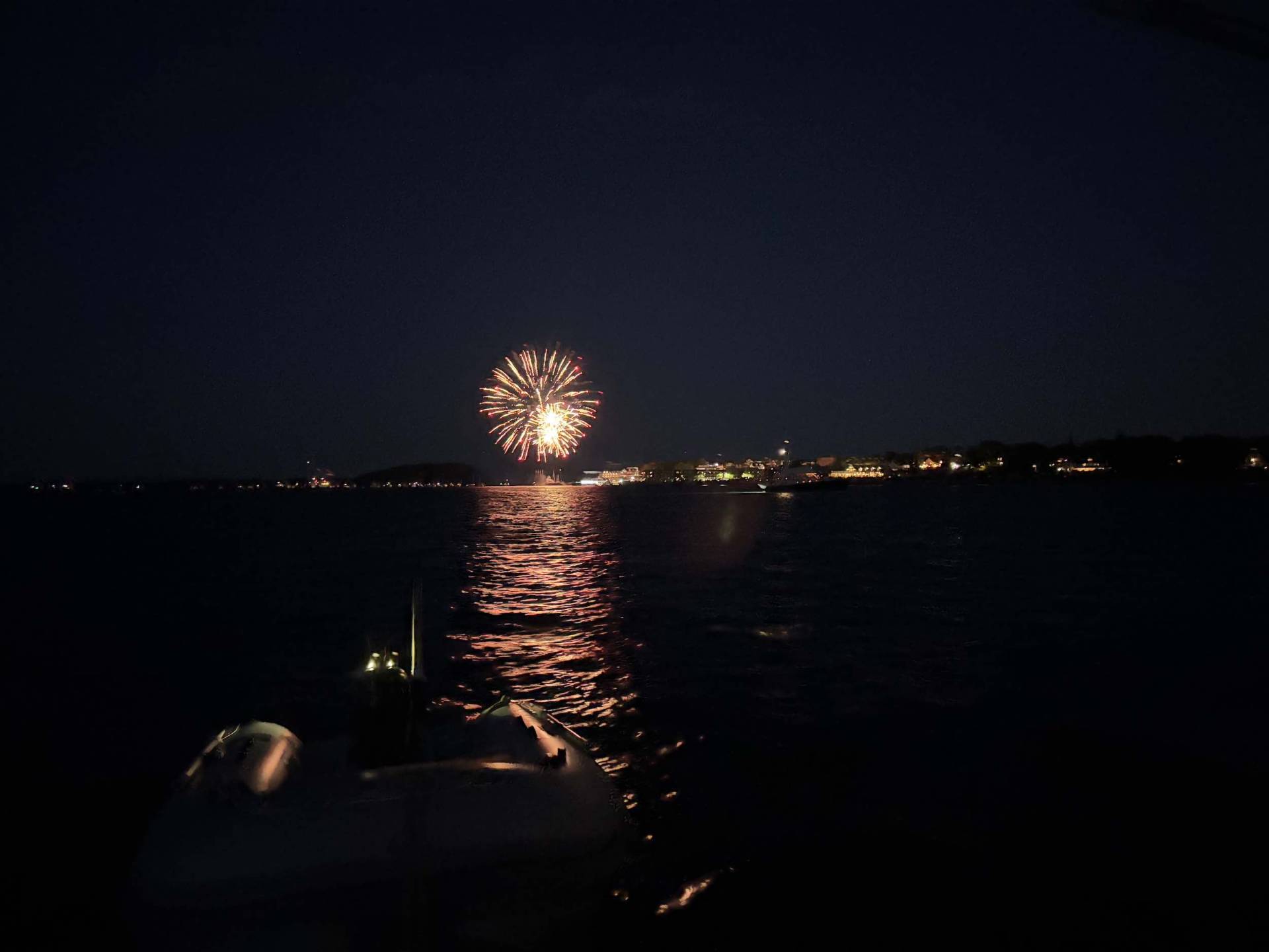 After a late lunch, we took a quick trip into town. Since they launch the fireworks from the Harbormaster pier, we had to bring the dinghy to the beach at Bridge Street. I didn’t love leaving it on shore (tied to the fence) with all the tourists around, but fortunately when we got back, all was as and where we left it. We wandered around town a bit and stopped into Leary’s for a drink. It was mid-afternoon and people were already camped out in the park, claiming their space for the fireworks. Bar Harbor is always busy, but it was absolutely SWARMED, so we were happy to retreat back out to Windara. Our anchorage was the perfect spot to watch the fireworks – a couple boats came in, but most people anchored closer to town.
